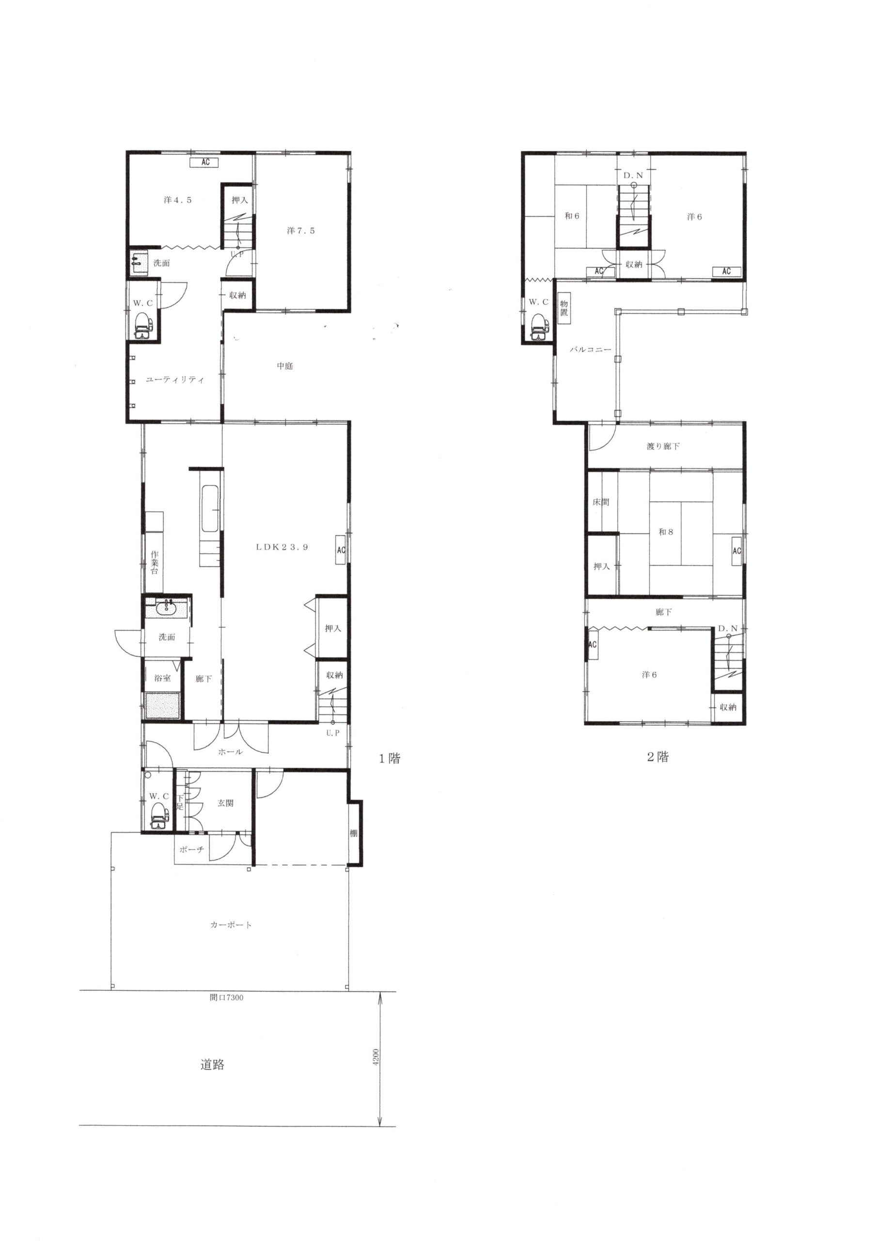 1階:LDK23.9・洋7.5・洋4.5・UT・浴室・洗面2ヶ所・WC2ヶ所・中庭